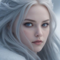 На картинке изображена молодая женщина с белыми волосами и поразительно голубыми глазами. У нее светлая кожа, и она словно смотрит прямо на зрителя. Ее волосы волнами ниспадают на плечи. Макияж включает в себя тщательно прорисованные брови и губы, выполненные в нежных тонах. Ее украшает изысканное золотое украшение, которое выделяется на фоне ее бледной кожи. Это и головной убор, напоминающий корону, и дополнительные элементы, которые можно интерпретировать как аксессуары или часть костюма. Фон размыт, но кажется, что это открытая местность с намеком на голубое небо. Общая атмосфера предполагает момент, запечатленный в фантастическом или историческом контексте.