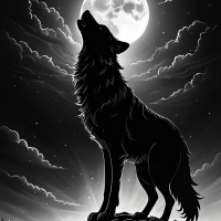 The image features a wolf howling at the full moon under a night sky with clouds and stars. The wolf is standing on what appears to be a hill or cliff, surrounded by trees. The moon is prominent in the sky, casting light on the scene.