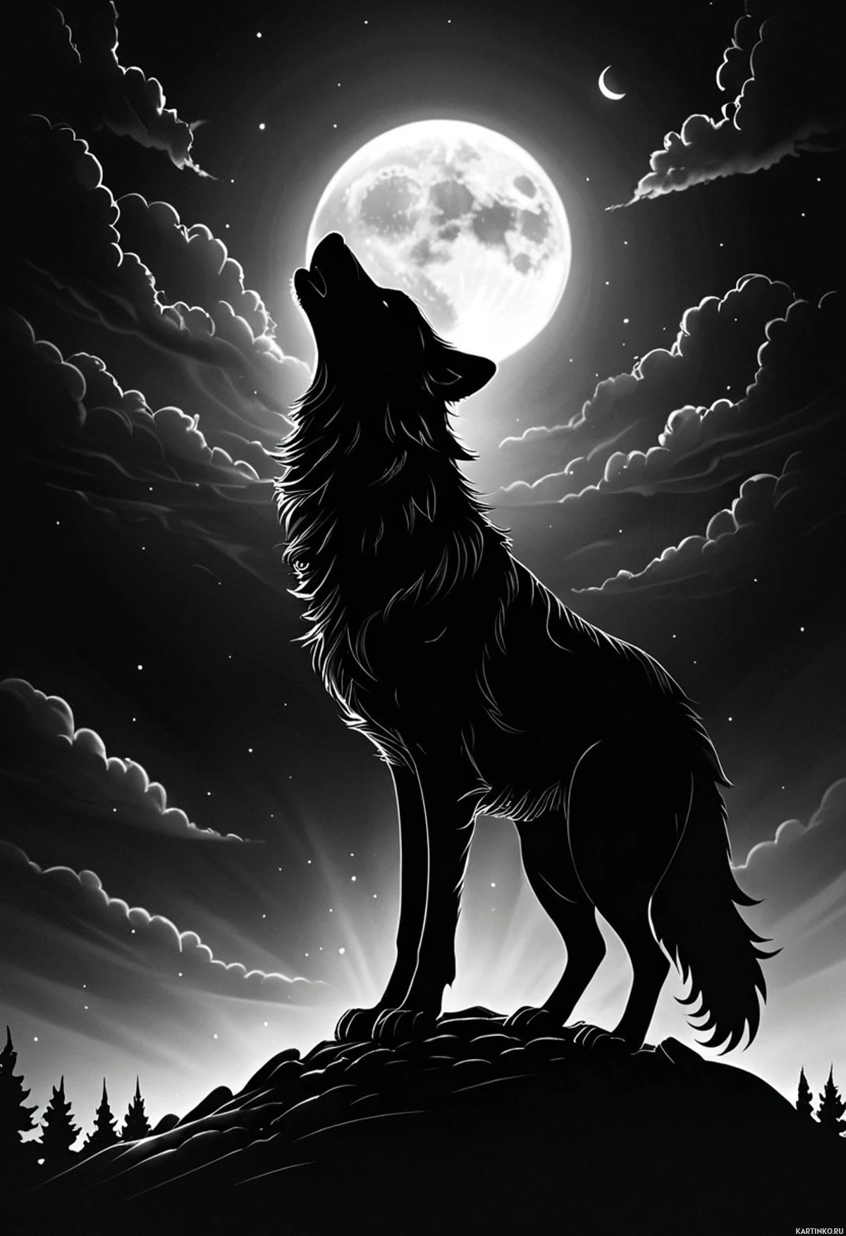 На картинке волк воет на полную луну под ночным небом, усыпанным облаками и звёздами. Волк стоит на возвышенности, окружённый деревьями. Луна ярко выделяется на фоне неба, заливая всё вокруг своим светом.