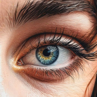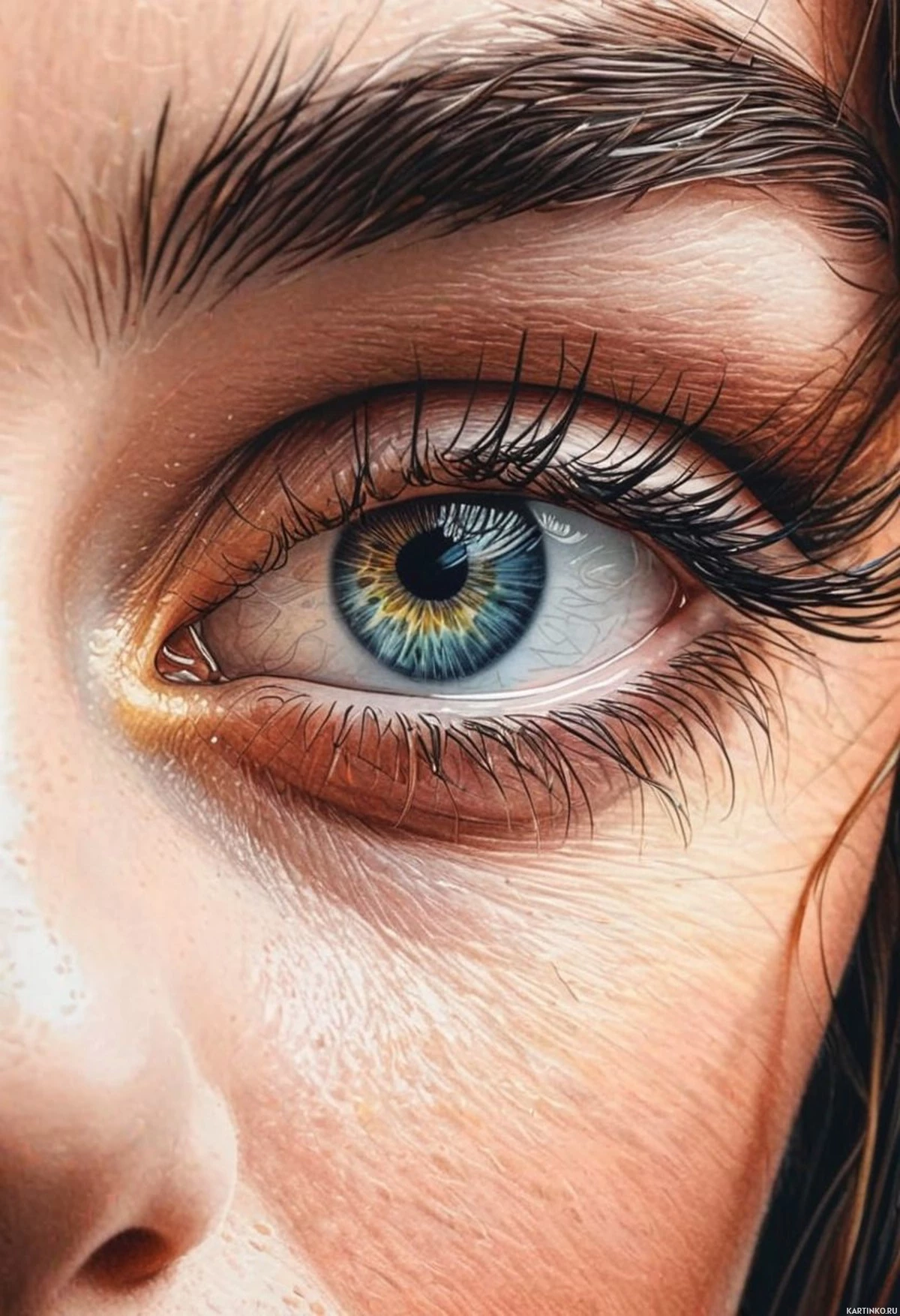 На картинке крупный план лица, акцент сделан на один глаз. Глаз с длинными ресницами смотрит прямо в камеру, демонстрируя голубой с жёлтым центром радужку, которую часто называют орехового или зелёного оттенка. Кожа вокруг глаза выглядит слегка накрашенной, подчеркивающей скулы и брови. На губах – лёгкий оттенок помады или блеска. Вокруг глаза заметно мягкое свечение, что говорит о наличии источника света. Фон нейтральный и размытый, чтобы акцент оставался на глазе.