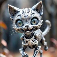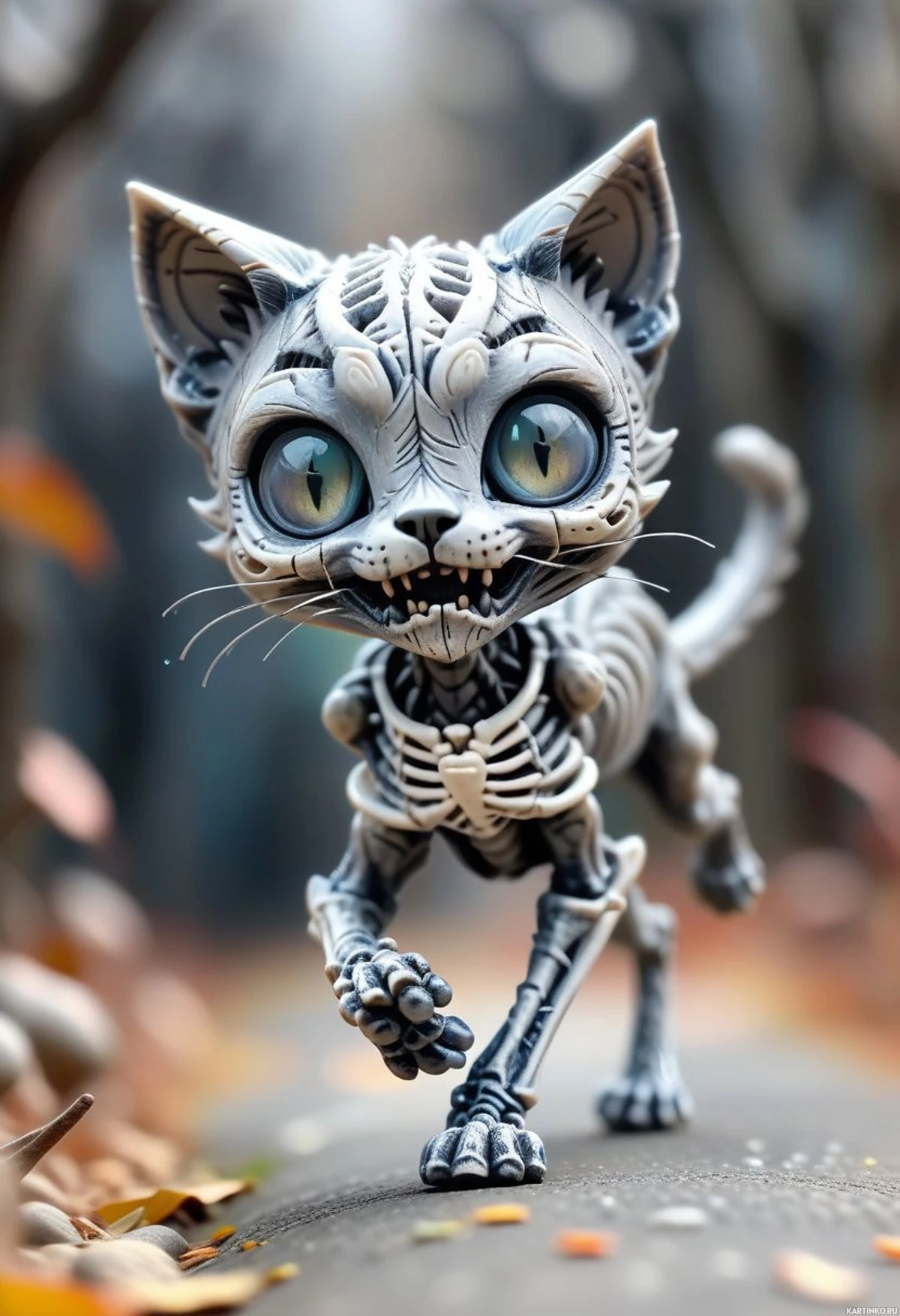 На картинке изображён скелет кошки, стоящий на четвереньках с открытой пастью, обнажающей острые зубы. Её глаза широко открыты и излучают жуткое свечение, придавая ей зловещий вид. Кошка стоит на том, что похоже на улицу в пригороде ночью, что видно по окружающей её темноте и опавшим листьям на земле.