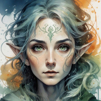 The image depicts an illustrated character who appears to be a fantasy elf. She has long, wavy silver hair and pointed ears typical of an elf's appearance in fantasy artwork. Her complexion is fair with a hint of rosy cheeks, and her eyes are a striking shade of blue with hints of green at the outer edges, which adds to her otherworldly features. She wears an open jacket that has intricate designs on it, suggesting a setting or storyline related to fantasy. There's a tattoo-like marking on her right cheek, adding to her mystical appearance. The style of the image is artistic and appears to be influenced by modern digital painting techniques with elements of splash and brush strokes that might indicate movement or energy around the character. The color palette is vibrant with a mix of cool blues and warm yellows, which creates a contrast that highlights her features. The background is abstract with what seems to be dripping paint or ink, enhancing the artistic and dynamic feel of the image.