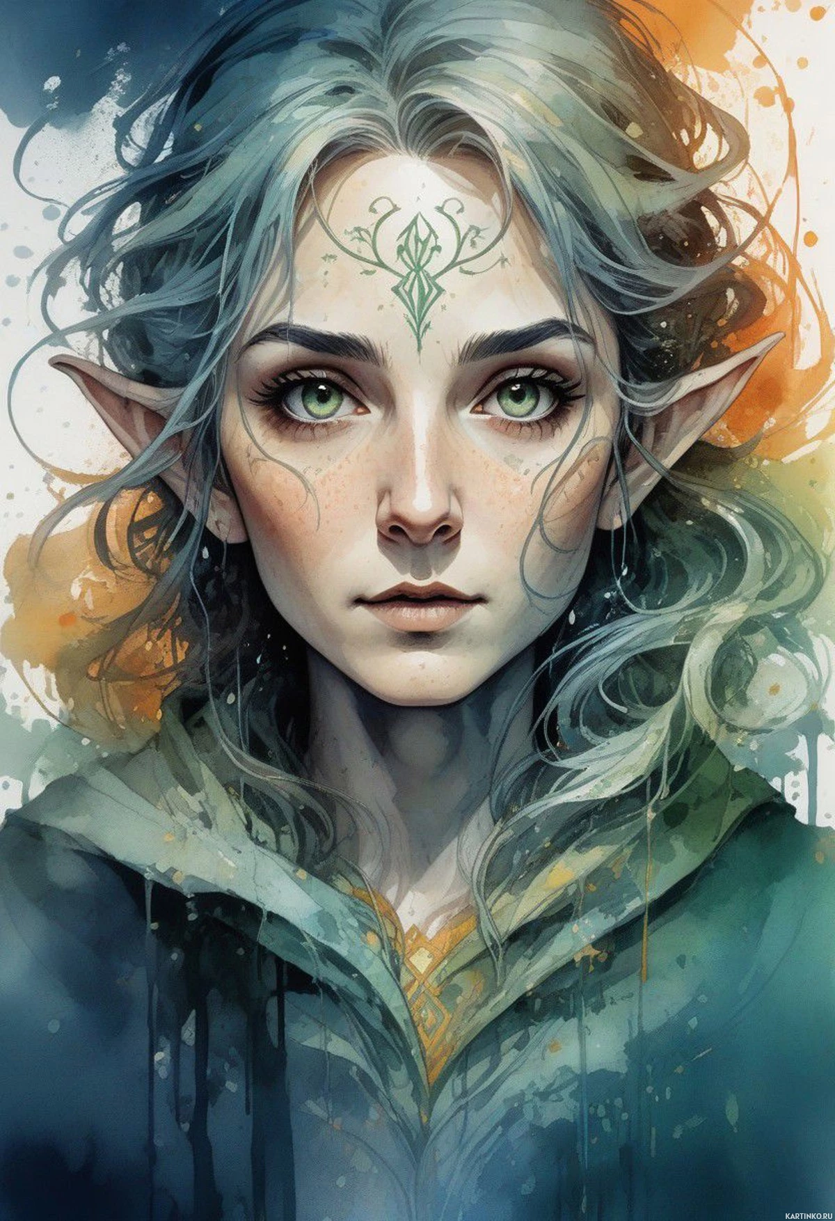 Картинка изображает персонажа, похожего на эльфа из фэнтези. У нее длинные волнистые серебристые волосы и заостренные уши, характерные для эльфийского облика в фэнтезийном искусстве. Ее кожа светлая, с легким румянцем, а глаза – поразительный оттенок синего с зеленоватыми краями, что придает ей неземную красоту. На ней открытая куртка с замысловатым орнаментом, намекающим на фэнтезийный сеттинг или сюжет. На правой щеке – татуировка, добавляющая мистичности ее образу. Стиль картинки художественный, выполнен в современной технике цифровой живописи с элементами брызг и мазков, что создает ощущение движения и энергии вокруг персонажа. Цветовая палитра яркая, с сочетанием холодных синих и теплых желтых оттенков, что создает контраст, подчеркивающий ее черты. Фон абстрактный, словно капли краски или чернил, усиливающие художественный и динамичный характер картинки.
