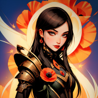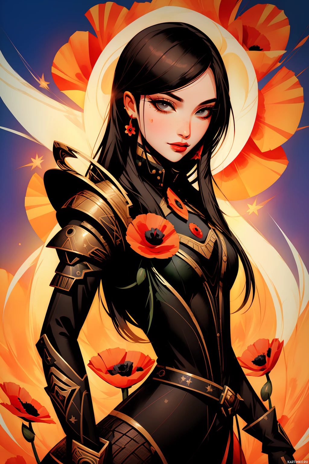 брюнетки | Скачать аватары с брюнеткой | Brunettes | Иллюстрация футуристического рыцаря в доспехах на фоне оранжевых цветов