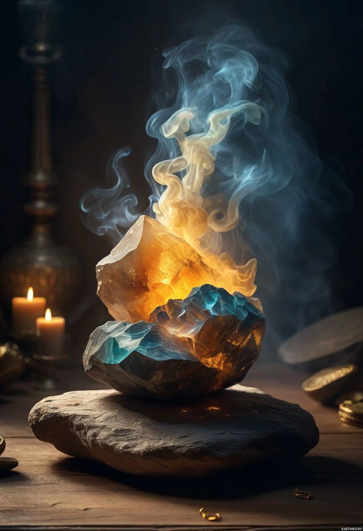 Картинка изображает фантастическую сцену, в центре которой – скала, будто расколотая надвое и выпускающая клубы дыма и искры. Скала расположена в окружении, напоминающем древние руины или, возможно, алхимическую лабораторию, с разбросанными вокруг предметами. Видны свечи, похоже, хрустальный шар и другие вещи, создающие мистическую атмосферу. Цветовая гамма выдержана в сине-фиолетовых тонах, подчеркивающих загадочность происходящего.
