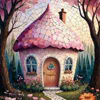 На картинке изображена иллюстрированная сцена: дом с соломенной крышей и дверью спереди, утопающий в пышном саду. У дома несколько окон, труба и круглое окно над дверью. Сад окружен цветами и растениями самых разных цветов – розовым, фиолетовым и жёлтым. Сад обрамлён деревьями с зелёной листвой, а к входной двери ведёт тропинка. На заднем плане – чистое небо с облаками у горизонта, создающими ощущение спокойствия.