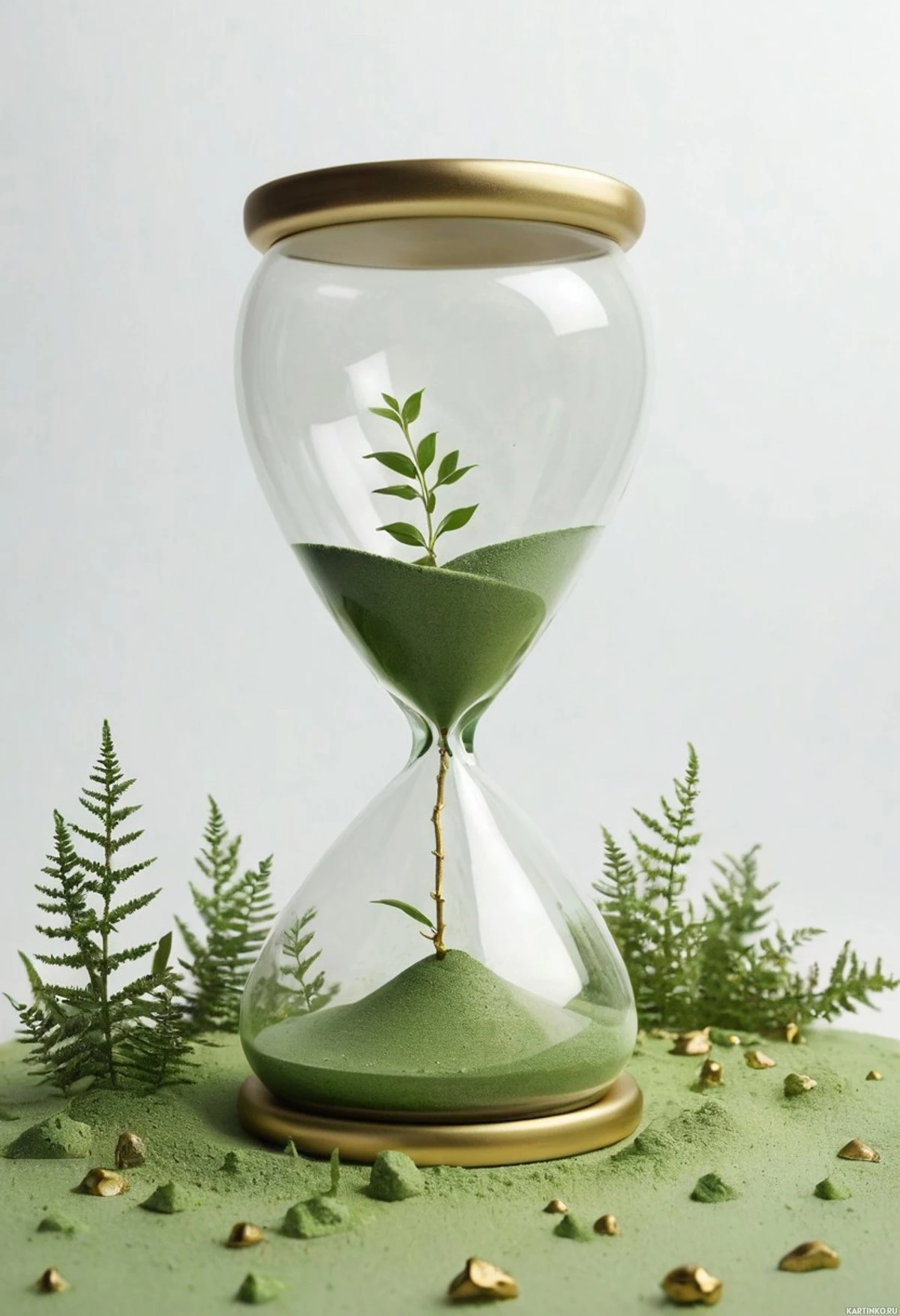 На картинке изображен прозрачный стеклянный песочные часы, половина которых заполнена песком, а другая — зелеными растениями. Под ними раскиданы зеленые растения, похожие на маленькие деревца или кустики, а вокруг них видны камни разных оттенков серого и зеленого.