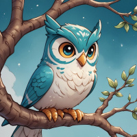 The image features a stylized illustration of an owl perched on a branch. The owl has prominent blue and white feathers with a distinctive pattern, including a striped head, stripes across the chest, and checkerboard patterns on the wings. It is depicted with a small beak, large circular eyes, and a slight tilt to its head as if looking at something in the distance. The background is a soft, pastel-colored sky with clouds, suggesting either dawn or dusk due to the warm colors.