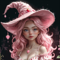 На картинке изображена героиня в розовой ведьминой шляпе, держащая в одной руке гроздь клубники, а в другой – что-то похожее на ягоду. У неё розовые волосы, которые гармонируют с цветовой гаммой её наряда. Её платье украшено оборками на рукавах и по низу, что свойственно женственному стилю, характерному для фэнтезийных или волшебных костюмов. Фон тёмный и фактурный, возможно, указывающий на ночное время суток или место с таинственной атмосферой.