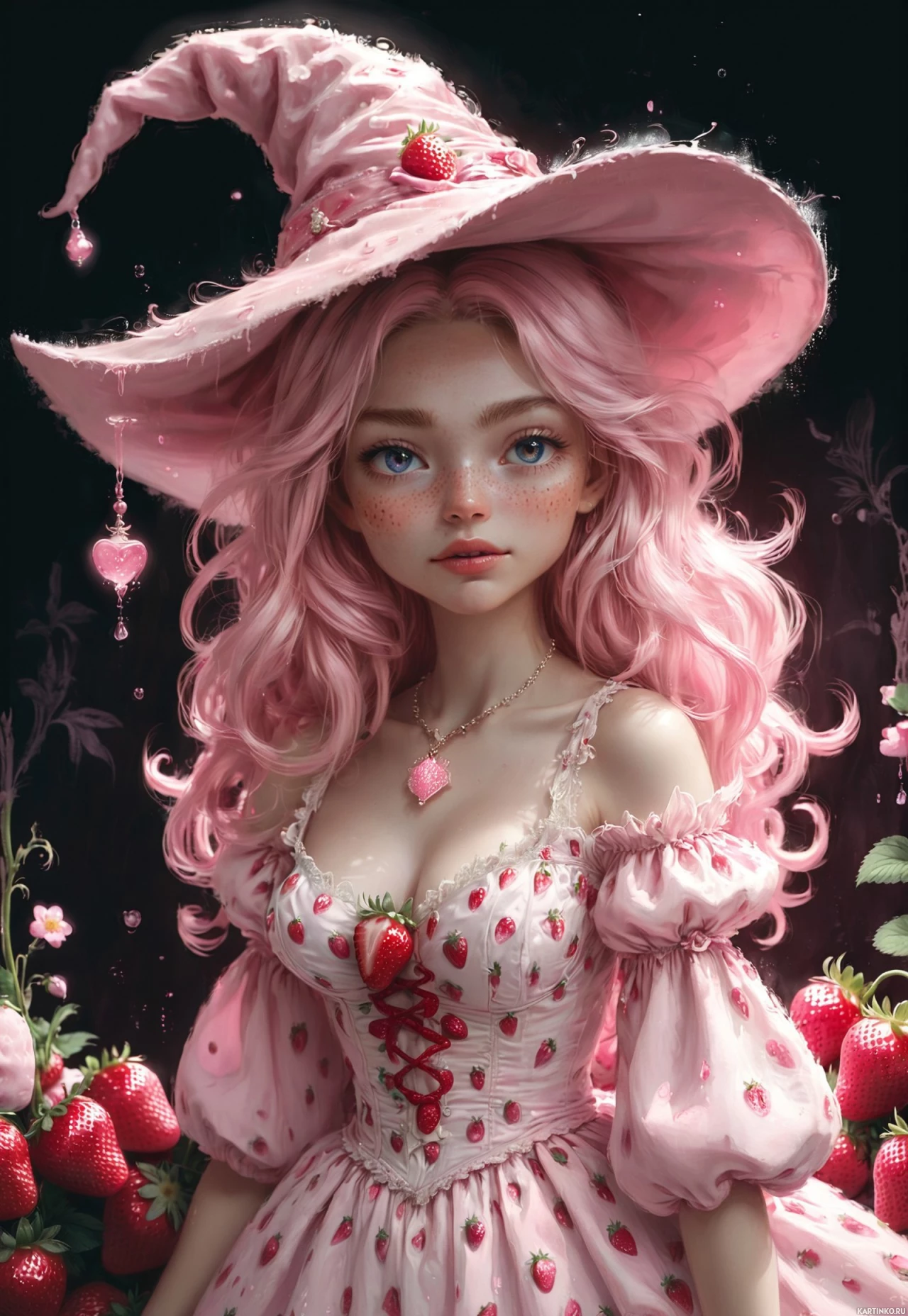 The image features a character wearing a pink witch hat and holding a cluster of strawberries in one hand while her other hand is adorned with what appears to be a berry. She has pink hair, which matches the color scheme of her outfit. Her dress has ruffles on the sleeves and at the bottom, suggesting a feminine style typical of fantasy or magical costumes. The background is dark and textured, possibly indicating a nighttime setting or a place with mysterious ambiance.