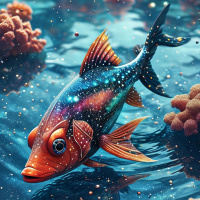 На картинке – стилизованное изображение рыбы в подводном пейзаже. Чешуя рыбы ярко-красная, оранжевая и жёлтая, с голубыми акцентами вокруг глаз, рта и жабр. Она плывёт по поверхности воды, которая кажется тёмной и отражающей, что намекает на большую глубину или, возможно, ночную сцену. Несколько пузырьков поднимаются к верху картинки, возможно, указывая на воздушные карманы от движения рыбы или на проникающий сквозь воду свет. Фон богат цветовыми переходами: от тёмных тонов внизу до более светлых, по мере того как он простирается вверх, усиливая ощущение глубины и пространства. Справа на картинке видны розовато-оранжевые структуры, которые можно интерпретировать как кораллы или какую-то форму водной флоры, добавляя разнообразия и цвета в подводный мир. Общее впечатление – фантастический реализм, где такие элементы, как цвета рыбы и пузырьки, кажутся более сюрреалистичными, чем можно ожидать в обычных подводных сценах.