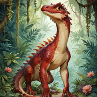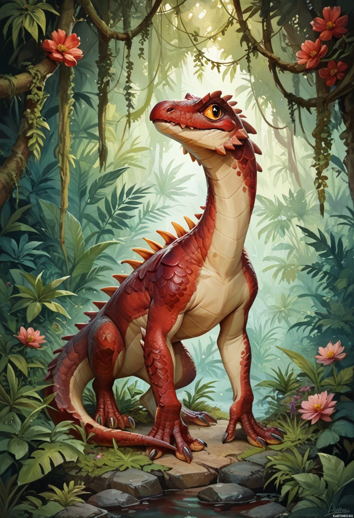 Картинка изображает фантастическую сцену с антропоморфным существом, похожим на красного дракона с зелёными глазами. Оно сидит на задних лапах и смотрит на зрителя. У существа мускулистое тело и шипы, идущие вдоль спины. Вокруг него — лесная местность с деревьями и листвой. На заднем плане видны свисающие лианы, а также яркие цветы, что говорит о пышной среде обитания. Существо смотрит вверх, на луч света, исходящий из источника, невидимого в кадре.