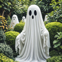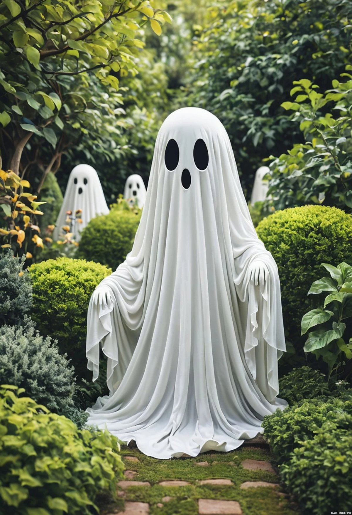 На картинке изображены три призрачных фигуры в саду. Центральная фигура, похоже, является традиционным образом призрака отца Гамлета. На ней наброшена простыня с прорезями для глаз, и она выглядит потрепанной. Вокруг нее стоят еще два призрака в классических белых простынях, без каких-либо дополнительных деталей. Они стоят за кустами, напоминающими форму черепов. Сад пышный, с ухоженной зеленью и кустарниками. Видна дорожка, ведущая к месту, где стоят эти фигуры.