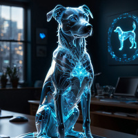 The image features a three-dimensional rendering of a dog sitting on what appears to be an illuminated surface, possibly a glowing desk with blue and green lights. The dog is grey in color and seems to be looking directly at the camera. In the background, there's a room with a window that allows natural light to enter, suggesting it might be daytime. On the wall, there are framed pictures of dogs. To the right, part of a monitor screen can be seen. The image has a futuristic and technological feel due to the illuminated desk and the glowing effect on the dog's skin.