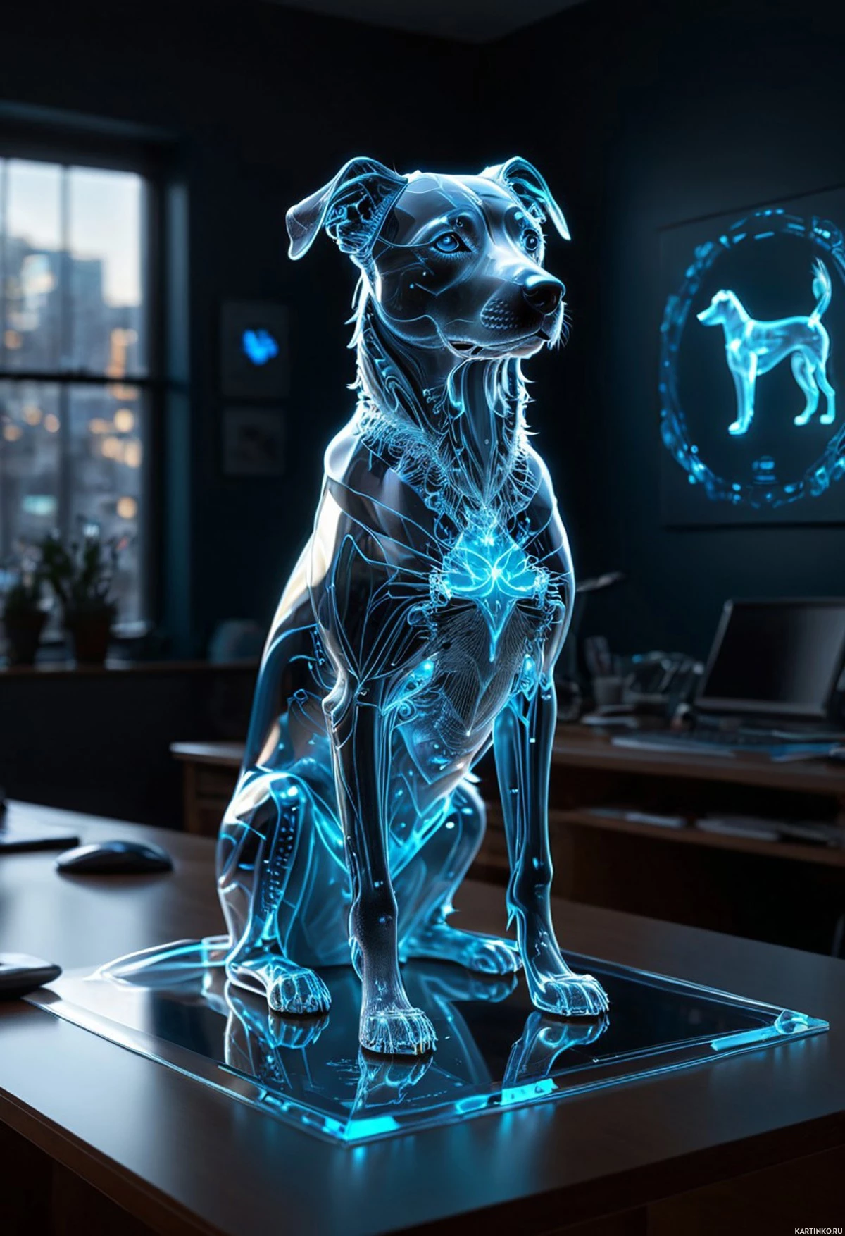 На картинке — трехмерная визуализация собаки, сидящей на светящейся поверхности, возможно, на подсвеченном столе с синими и зелеными огнями. Собака серого цвета и смотрит прямо в камеру. На заднем плане видна комната с окном, из которого проникает естественный свет, что говорит о дневном времени суток. На стене — рамки с фотографиями собак. Справа виднеется часть экрана монитора. У картинки футуристический и технологичный вид благодаря подсвеченному столу и свечению на коже собаки.