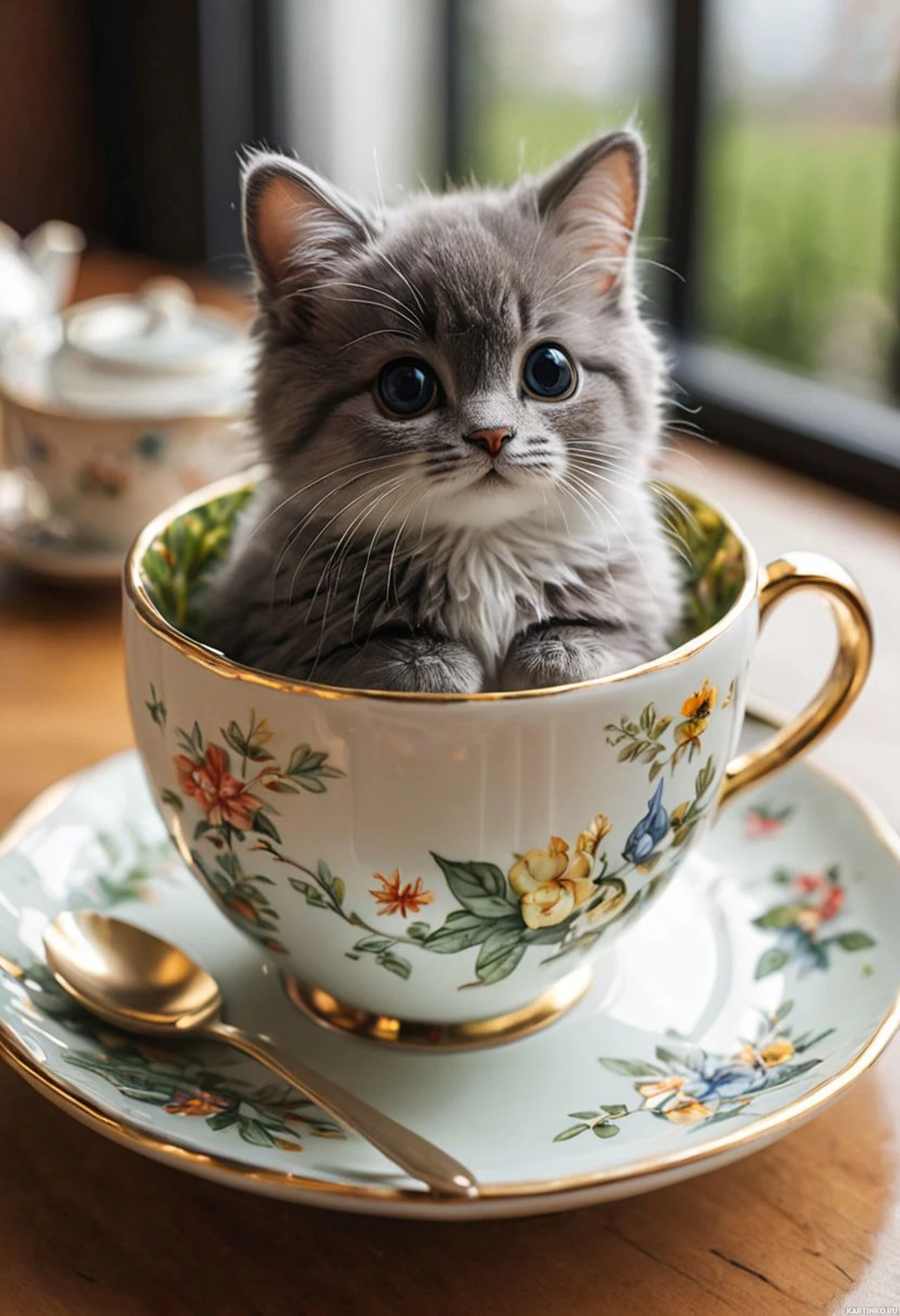 На картинке маленький котенок с выразительными голубыми глазами сидит в чашке, которая стоит на керамической блюдце с цветочным узором.