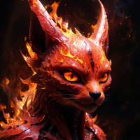 The image features a character that appears to be a stylized, anthropomorphic fox with flames emanating from its head and a crackling energy around it. The fox has red fur with white markings on its face and ears. It is depicted in a fantasy-style setting with dark and ominous tones, suggesting a theme of fire or destruction. The character's eyes are yellow and glowing, contributing to the fiery aesthetic. The overall impression is one of power and mysticism.