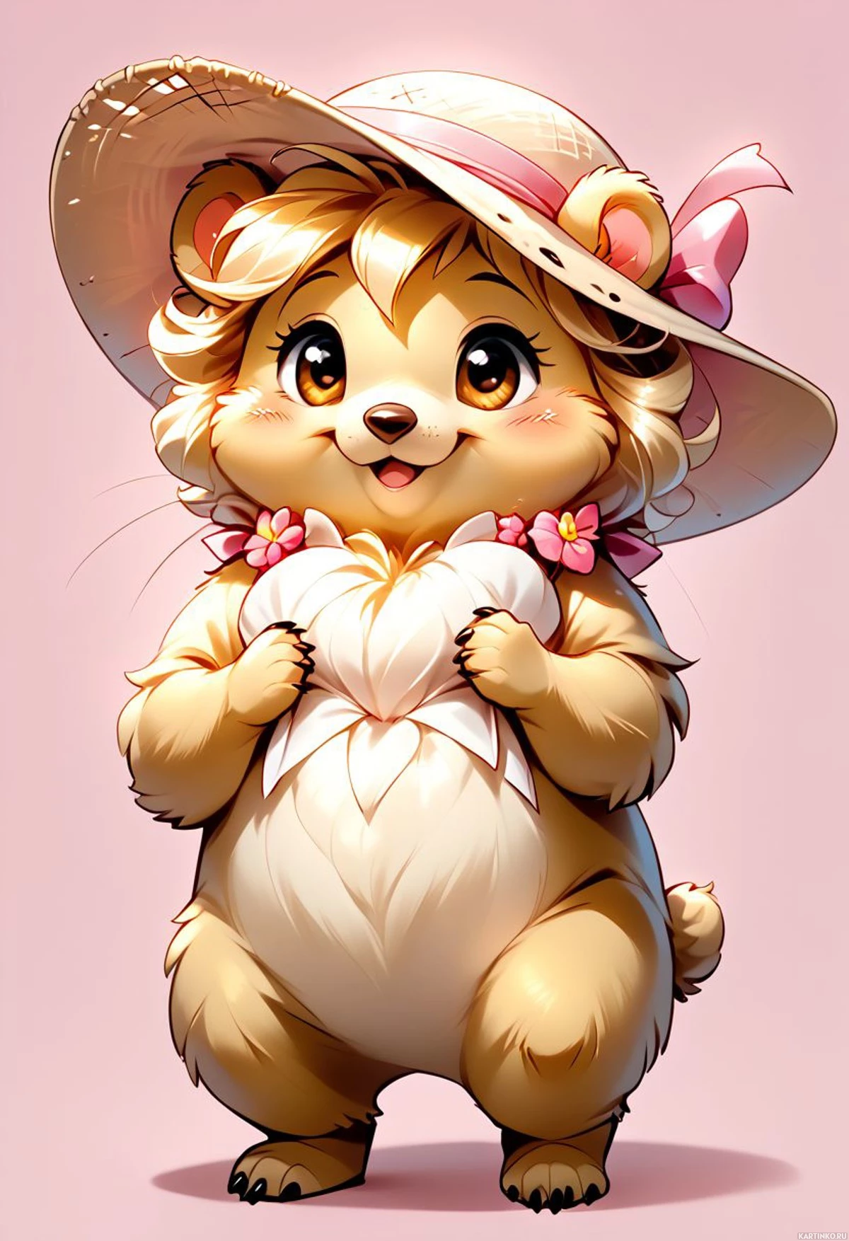 The image features a cute cartoon character that appears to be an animal, possibly a fox given the pointed ears and long snout. This character is wearing a wide-brimmed hat, which suggests it may be designed for a female or as a unisex style. It has large expressive eyes, and its mouth is slightly open in a friendly manner. The overall impression is that of a whimsical, charming creature likely intended to evoke feelings of affection or playfulness.