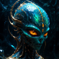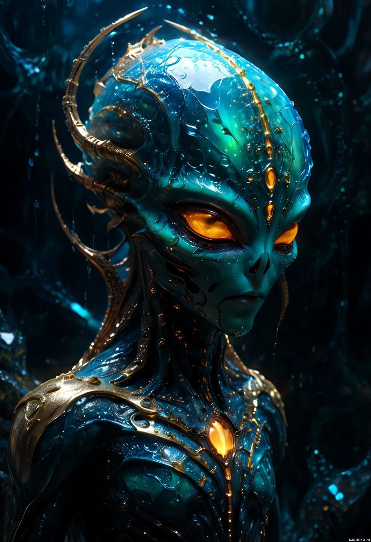 The image features a science fiction-themed illustration of an alien character. The alien has a humanoid form with blue skin and prominent eye sockets from which glowing orange eyes are visible. It has elongated ears and a series of spiky structures on its head, resembling antlers or horns. The face is smooth with no visible facial hair or expression. The alien's body has a textured appearance reminiscent of scales or armor, with gold-colored decorative elements that could be interpreted as symbols or insignia. There are droplets around the image, suggesting it might be wet or in a moist environment.