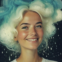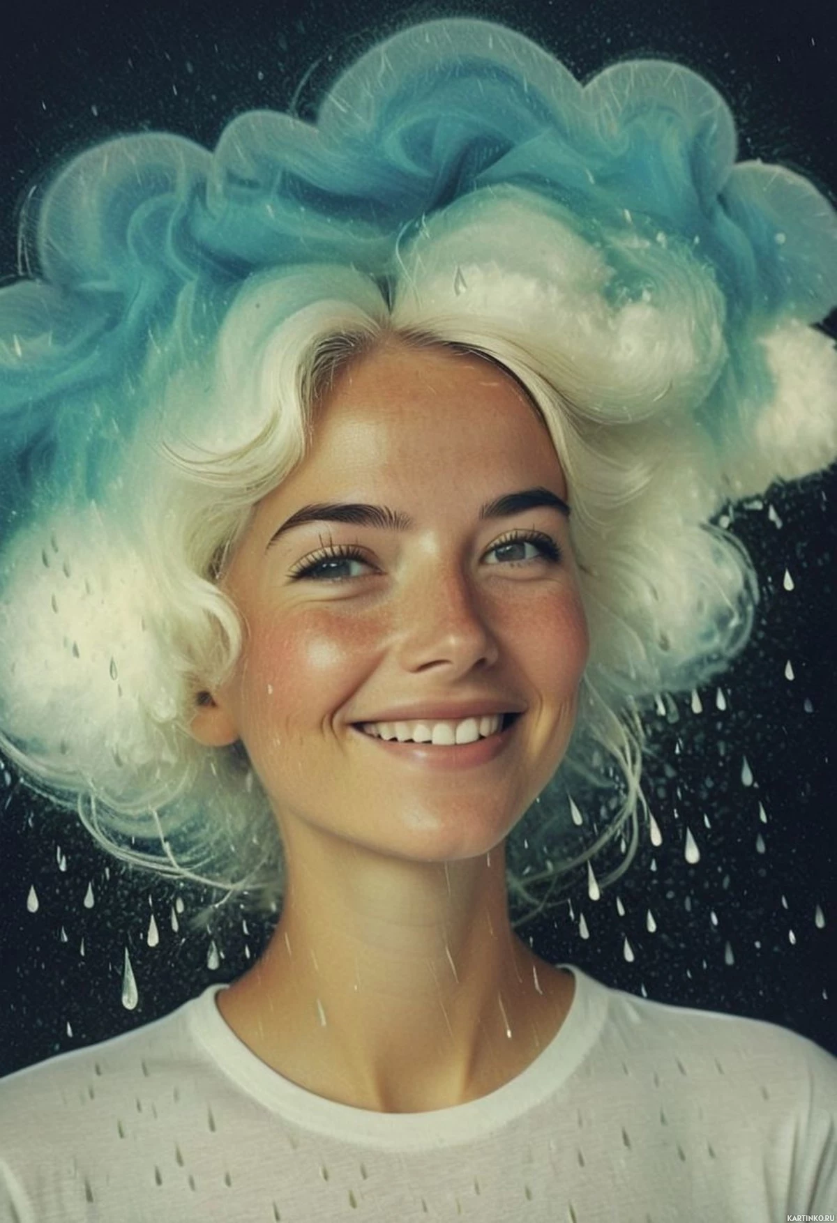a striking shade of blue, and she has a warm, inviting smile on her face. She appears to be in motion or perhaps dancing, as suggested by the droplets falling around her head. Atop her head is an elaborate hairstyle made up of large, fluffy