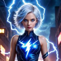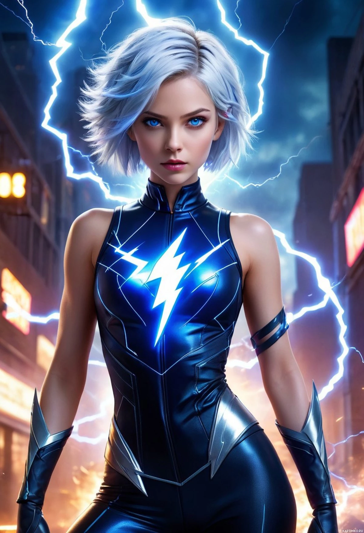 На картинке изображена героиня с белоснежными, гладко зачесанными волосами. У нее пронзительные голубые глаза и серьезное выражение лица, в котором чувствуется напряжение. Кожа ее светлая, а из области груди исходят видимые эффекты молнии, что указывает на элемент силы или энергии в ее облике. На ней облегающий черный комбинезон, подчеркивающий рельеф мускулов на руках и плечах. Комбинезон украшен металлическими деталями, добавляющими ему футуристический вид.