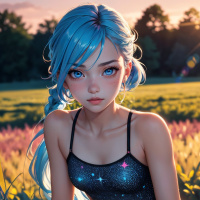 The image features a stylized depiction of a female character with blue hair. She has large, expressive eyes and a small nose, which are common traits in digital artwork designed to be appealing and expressive. The character is wearing a black crop top that has a galaxy print on it, suggesting a cosmic or space theme. Her pose is relaxed as she sits down with one hand resting on her hip and the other leg bent at the knee. She is looking directly at the viewer with a neutral expression. The background of the image shows a serene outdoor setting with a grassy area, trees, and a clear sky that suggests it could be either sunrise or sunset due to the warm lighting.
