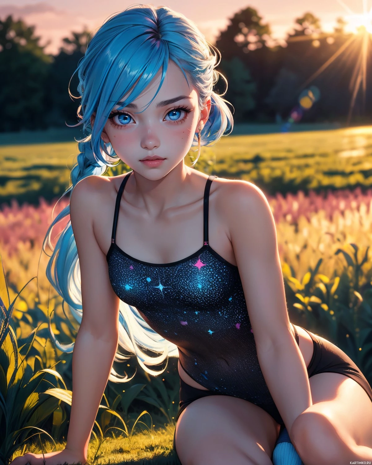 Девушка с голубыми волосами позирует на поле Картинки с такими же тегами