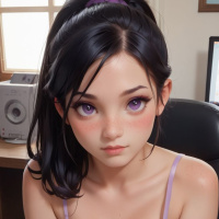 a fair complexion and is wearing what appears to be a denim jacket or vest over a pink bra. Her expression is somewhat somber as she gazes downwards. In the background, there is a desk with various computer equipment on it, including a monitor displaying a social media platform, suggesting she might be in