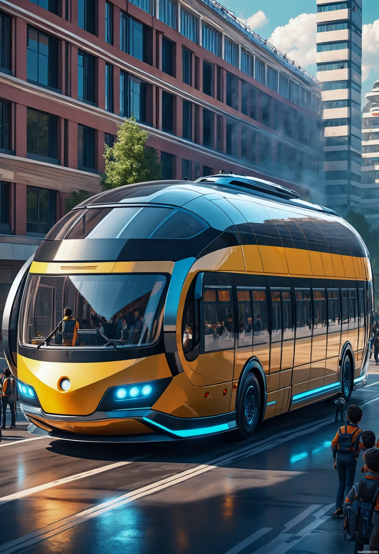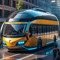 На картинке изображен футуристический желтый автобус со стильным дизайном и большими окнами, едущий по, по всей видимости, городской улице в светлое время суток. У автобуса необычная передняя часть, намекающая на передовые технологии или элементы научной фантастики, возможно, указывающая на наличие автопилота. На тротуаре пешеходы наблюдают за автобусом, одетые в повседневную одежду и занимающиеся разными делами: кто-то смотрит в камеру, кто-то разговаривает. На заднем плане видны здания в традиционной городской архитектуре, а над ними – чистое небо.