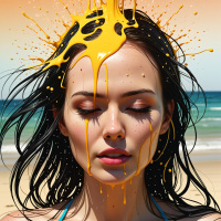 На картинке изображена женщина, стоящая на пляже на закате – об этом говорят теплые оттенки в небе. У неё длинные темные волосы и она одета в голубой купальник с белым узором. Глаза женщины закрыты, на лице – спокойное выражение. Вся голова и плечи покрыты жёлтой краской, создавая впечатление, что её недавно нанесли или бросили. Пляжный пейзаж указывает на песок под ногами, а атмосфера сцены излучает умиротворение, которое контрастирует с ярким цветом краски.