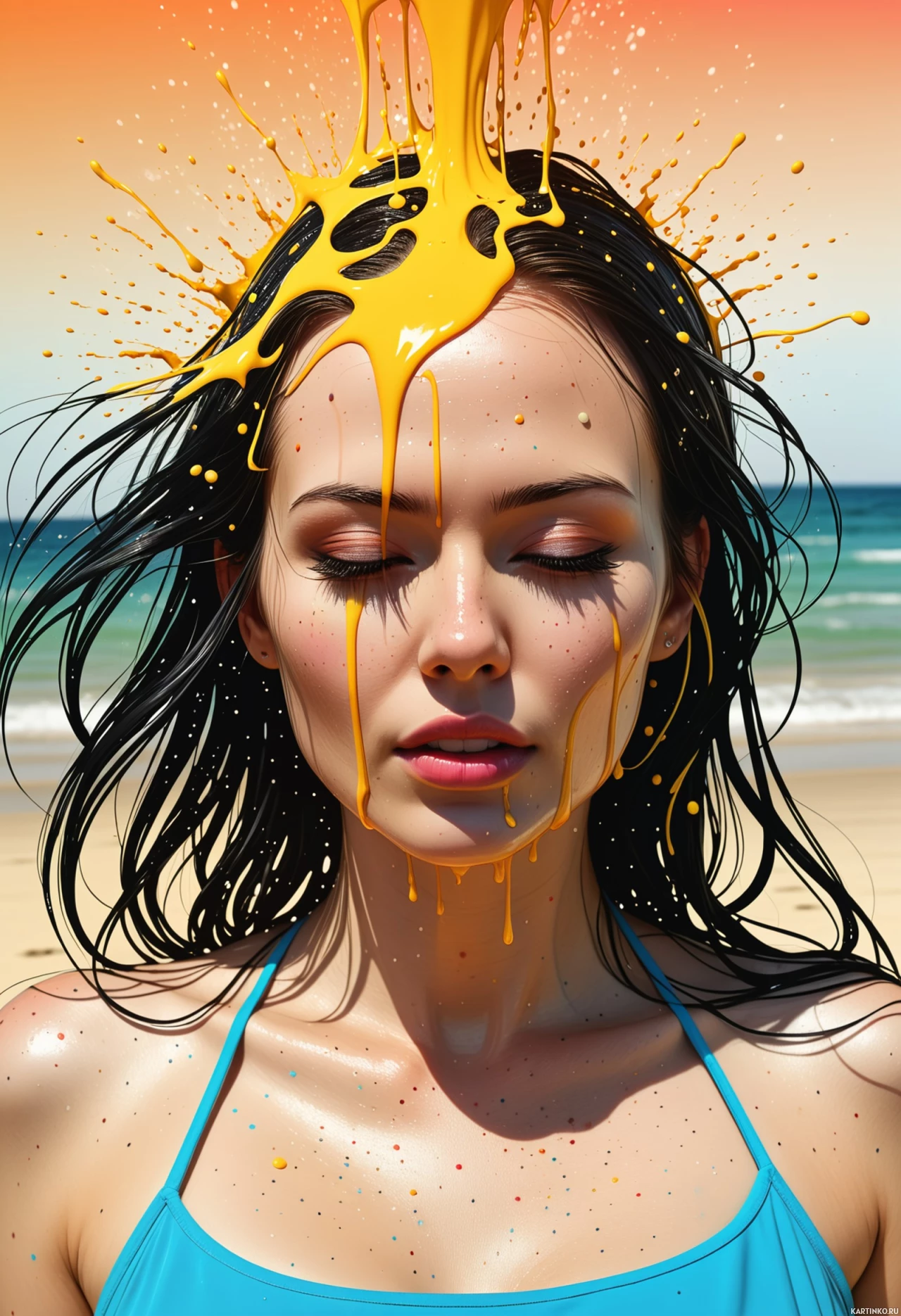 The image depicts a woman standing on a beach at what appears to be sunset, given the warm colors in the sky. She has long dark hair and is wearing blue swimwear with white patterns. The woman's eyes are closed, and she has a serene expression on her face. There is yellow paint splattered all over her head and shoulders, giving the impression that it has been recently applied or thrown at her. The beach setting suggests sand beneath her feet, and there's a calmness to the scene that contrasts with the vibrant color of the paint.