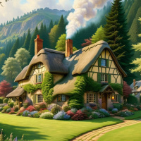 This image depicts a charming, fairy-tale-like house nestled in a lush,