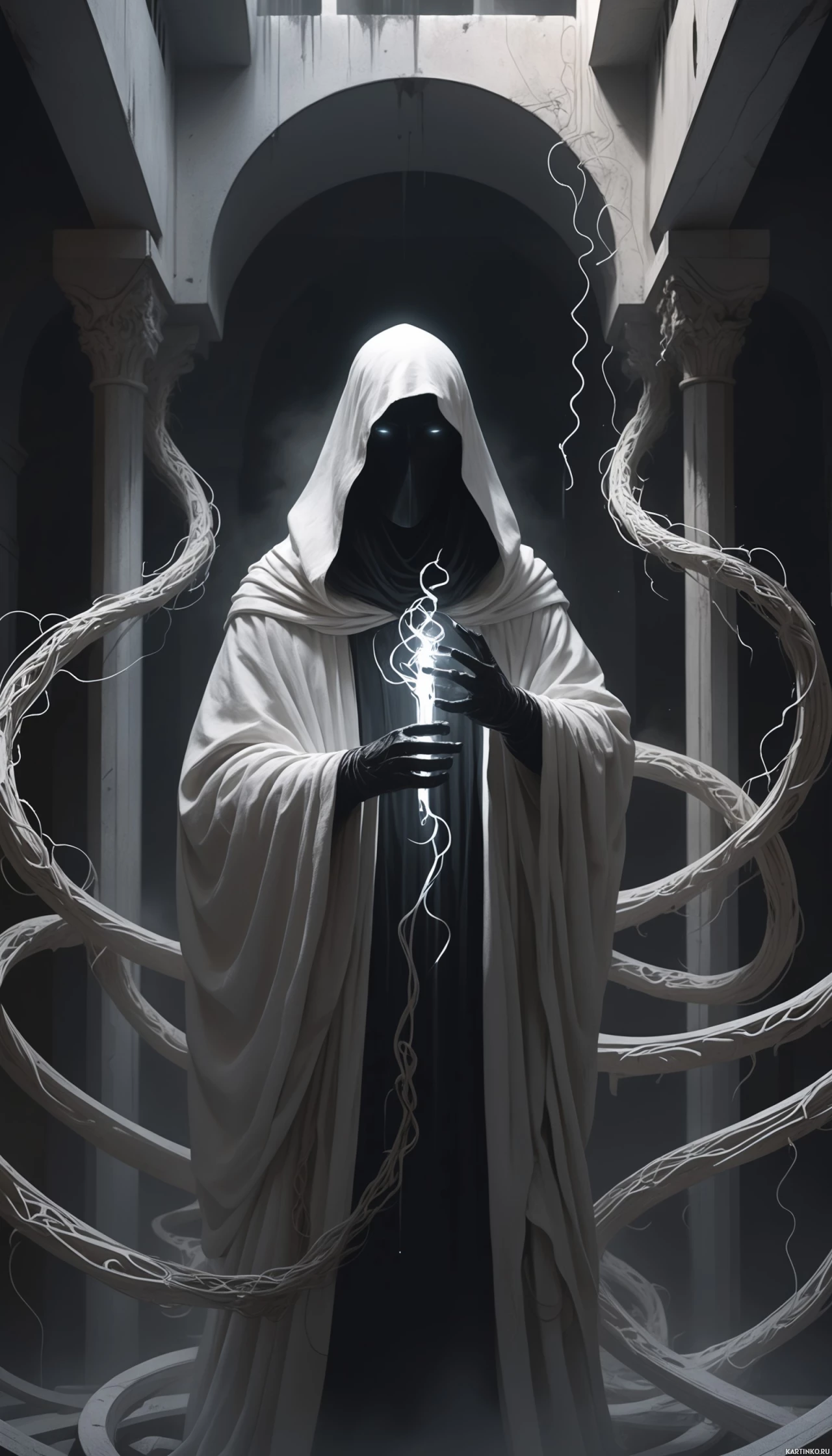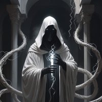 A depiction of a fantasy character within an artistic style that combines elements of historical and supernatural themes. The figure is cloaked with hood, holding what appears to be a magical or mystical object between two hands, evoking the essence of a sorcerer or alchemist. A serpent wraps around their lower body, contributing to an aura of power and mystery. The setting includes arched structures that could suggest a temple-like environment, enhancing the fantastical atmosphere.
