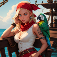 На картинке изображена женщина с светлыми волосами, сидящая на части лодки, на боковой поручне. Одна рука покоится под подбородком, взгляд направлен в сторону, от зрителя. На её плече сидит разноцветный попугай, выглядящий спокойным. У женщины на голове – красная бандана, а на ней надета майка без рукавов, розоватого оттенка, открывающая часть живота. На руках у неё видны татуировки.