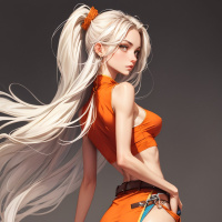 The image depicts a person standing against a neutral background. The individual appears to be facing away from the camera, showing their back profile. They have long white hair and are wearing an orange dress with blue trim along the hem. The style of the dress suggests it could be inspired by historical or fantasy fashion.