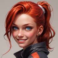 The image features a young woman with red hair styled in a side-swept bang and tied back into a high ponytail. She is smiling at the viewer, showing her teeth. Her makeup includes defined eyebrows and eyeshadow that highlights her blue eyes. She has rosy cheeks and what appears to be freckles on her face. The woman is wearing a black zip-up jacket with leather-like patches on the shoulder area. The background of the image is plain and does not provide any additional context or details.