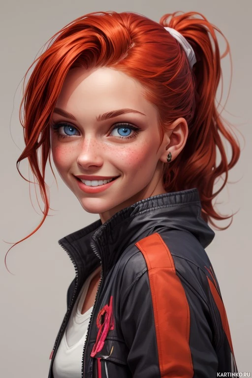 На картинке изображена молодая женщина с рыжими волосами, уложенными набок и собранными в высокий хвост. Она улыбается, обнажая зубы. На ней четко подведенные брови и тени для век, подчеркивающие голубые глаза. Щеки у нее румяные, а на лице видны веснушки. Женщина одета в черную куртку на молнии с декоративными вставками, имитирующими кожу, на плечах. Фон картинки однотонный и не несет дополнительной информации.