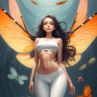 The image depicts a female figure with wings sprouting from her back. She has long brown hair and is gazing directly at the viewer. Her body appears to be human, while her upper torso seems to have merged with that of a butterfly. There are additional butterflies flying around her, contributing to a dreamlike or fantasy atmosphere. The setting includes mushrooms on what appears to be a forest floor, and there is a glowing light at the top, possibly suggesting a celestial body or anotherworldly energy source. The style of the image is digital art with a focus on fantasy and the supernatural.