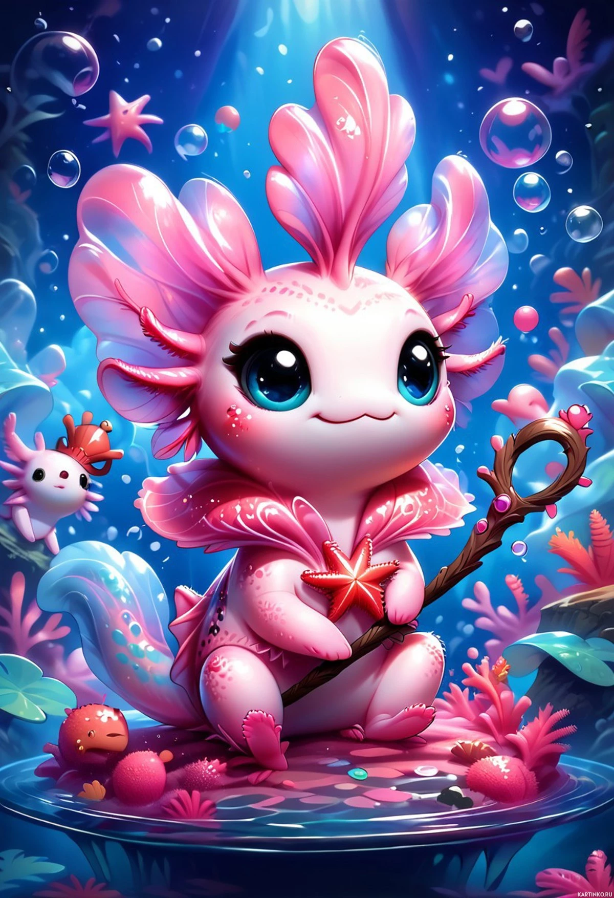 fantasy creature or a pet of the axolotl-like character. The overall style is colorful and whimsical, indicative of