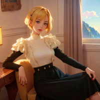На картинке – трехмерная визуализация девушки с золотистыми волосами в стильной одежде, включающей высокий воротник, возможно, часть корсета или похожего элемента. Она сидит на подлокотнике дивана, спокойно глядя на зрителя. На заднем плане – безмятежный пейзаж с горами и облаками под голубым небом.