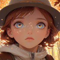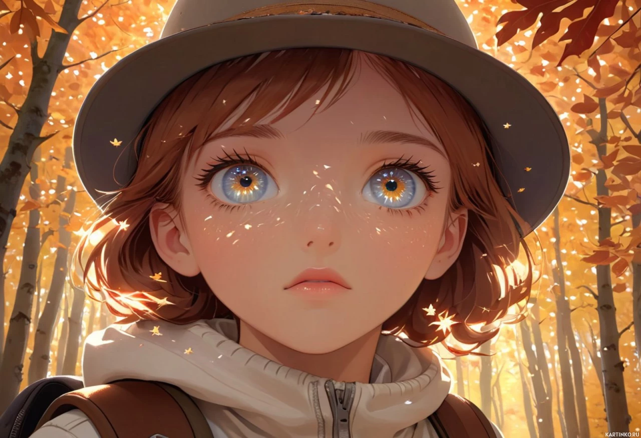 На картинке – трехмерная цифровая работа: молодая девушка с рыжими волосами, в коричневой шляпе и, кажется, в куртке с поднятым капюшоном. У неё голубые глаза, и она смотрит прямо на зрителя с невозмущенным выражением лица. На заднем плане – осенний лес с деревьями, окрашенными в теплые цвета, и золотыми листьями, усыпанными на земле, что создает ощущение наступления осени. Свет, льющийся сверху, отбрасывает на сцену мягкое, теплое сияние.
