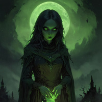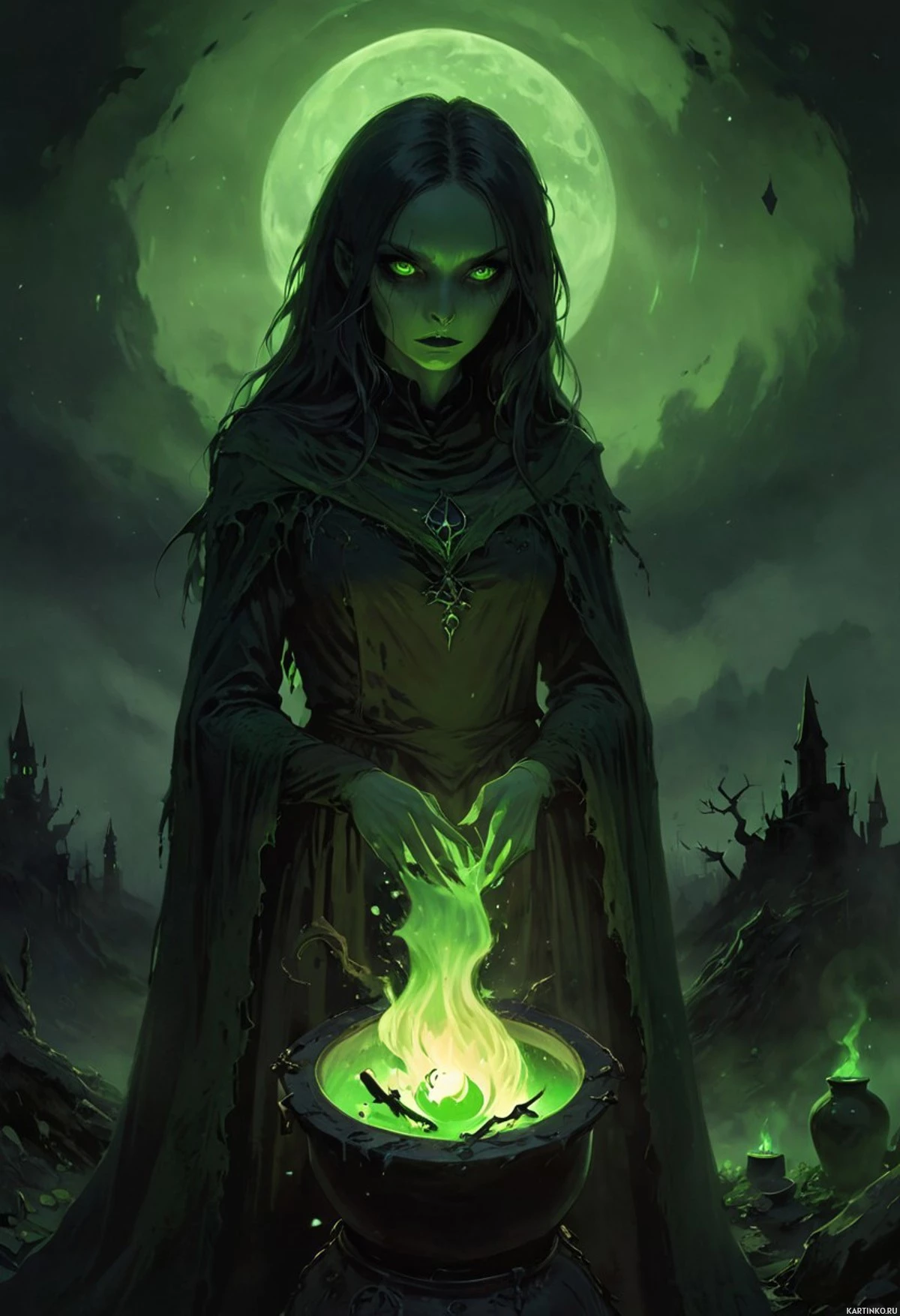 Картинка изображает фэнтезийную иллюстрацию с изображением девушки. У неё длинные тёмные волосы, на ней плащ с капюшоном. Её взгляд напряжённый и направлен на зрителя. В правой руке она держит нечто, похожее на посох или волшебную палочку, а в левой – зелье или жидкость, светящуюся зелёным светом, что намекает на магические свойства. Девушка стоит на неровной поверхности, возможно, указывающей на суровую, открытую местность. На заднем плане – тёмное небо с облаками и виденной луной, создающей жутковатую атмосферу. В картине чувствуется таинственная и мрачная атмосфера, передающая суть фэнтезийных жанров в литературе и медиа.