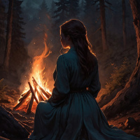 На картинке – молодая девушка с длинными темными волосами сидит на каменистой земле, скрестив ноги. Она стоит спиной к нам, глядя на ночное небо, где видна полная луна. Справа от нее – небольшой костер, языки пламени которого танцуют и отбрасывают оранжевое сияние на всю сцену. На девушке длинное платье, которое достает до земли. На заднем плане – силуэты деревьев и лесной подстилки.