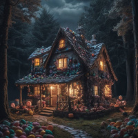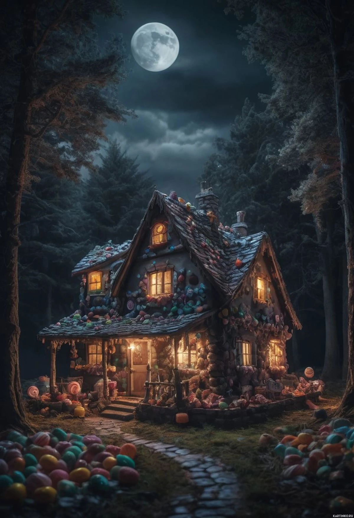 related event or theme. The ground is carpeted with grass, and trees can be seen in the background, reinforcing the impression of a peaceful, woodland setting. The moon is visible in the sky, lending a serene and nocturnal atmosphere to the image. The house's location seems remote and secluded, yet it does not lack charm or character, making it an idyllic depiction of a cozy countryside home during what could be Easter time.