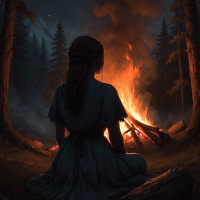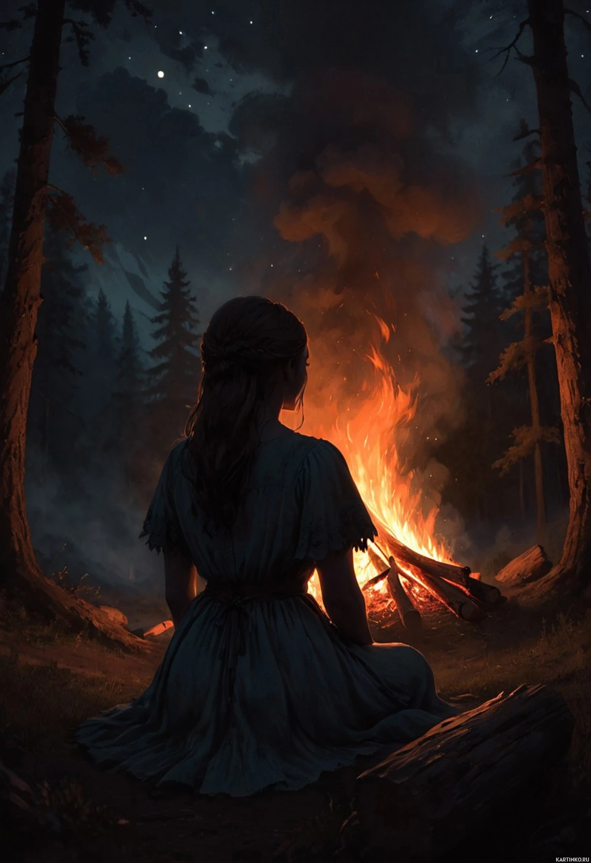 На картинке изображена девушка, сидящая на камне в ночном лесу. Спиной к зрителю она сидит в платье. Справа от неё горит яркий костер, языки пламени тянутся в тёмное небо. На заднем плане видны деревья. Цвета в работе приглушенные, преимущественно холодные, создающие ощущение спокойствия и одиночества. Кажется, будто запечатлён тихий момент в природе, возможно, под полной луной или звёздным небом.