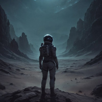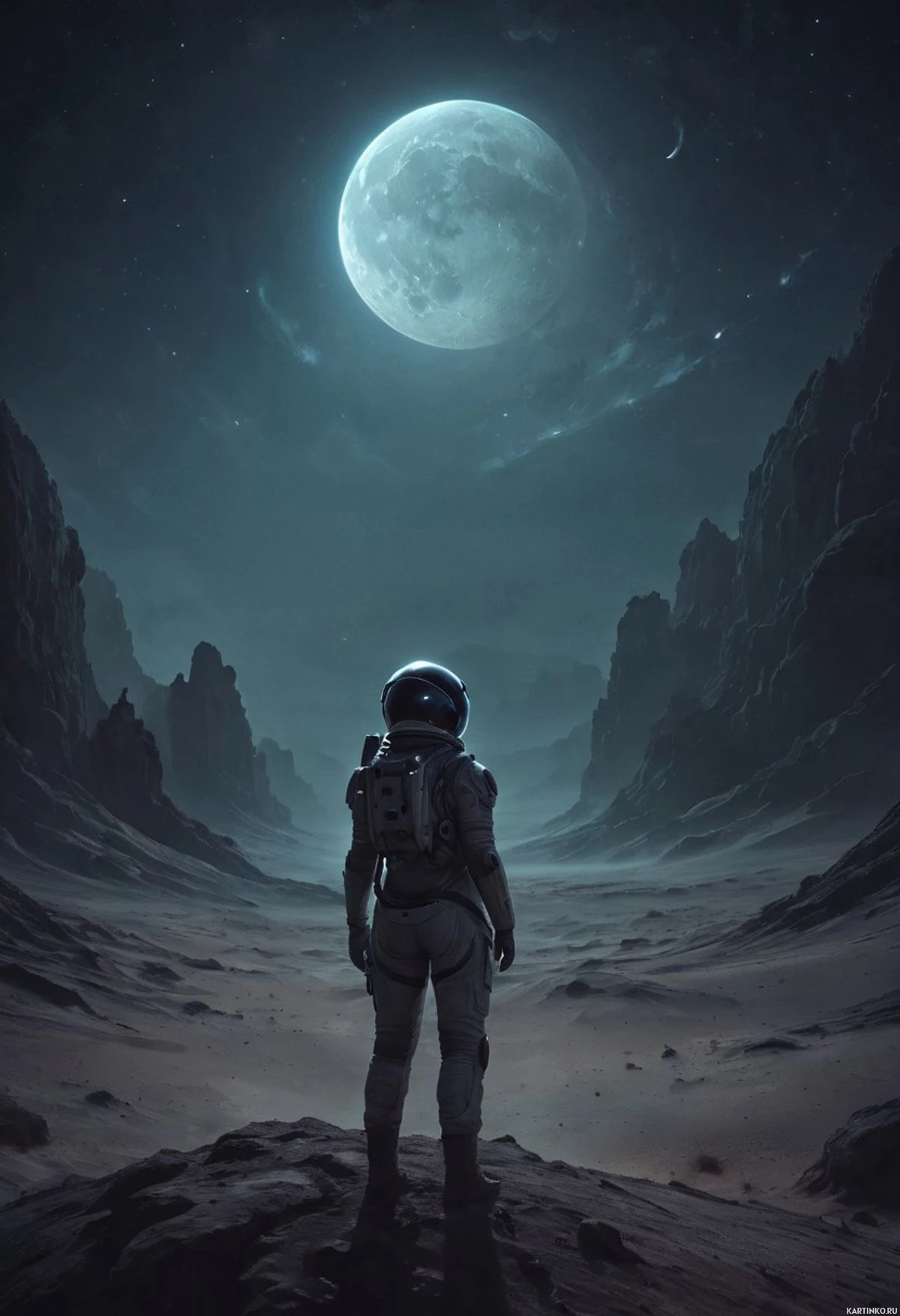 Картинка изображает научно-фантастическую сцену. На переднем плане стоит космонавт на том, что похоже на безжизненную поверхность луны ночью. Над головой космонавта ярко видна луна. Ландшафт вокруг него состоит из каменистой местности со скалами, уходящими вдаль к горизонту под звездным небом. Цветовая палитра в основном темная и приглушенная, что создает ощущение неземной атмосферы.