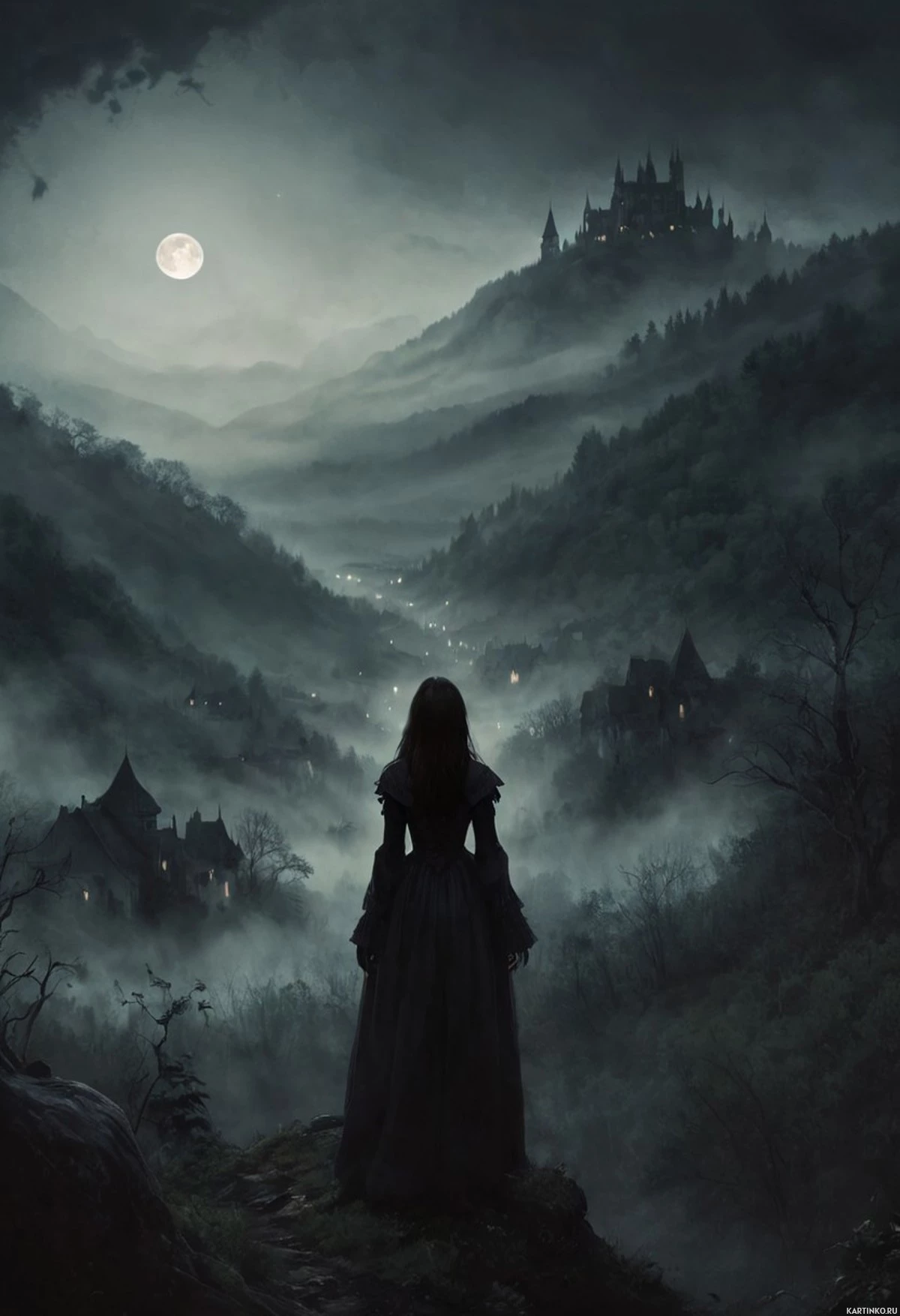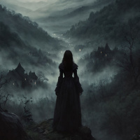 На картинке молодая девушка в изящном платье стоит на скалистом выступе, с видом на темную долину. Она смотрит вдаль, задумчиво положив руку на бедро. Долину окутывает туман и густой туман, придавая ей неземной вид. По обеим сторонам от долины возвышаются горные районы, усеянные огнями, которые, кажется, указывают на небольшие городки или деревни, затерянные в этих долинах. На заднем плане высится замок под затянутым облаками небом, отбрасывая драматическую тень на всю сцену. Картинка пропитана оттенками синего и зеленого, что создает ее мрачную атмосферу.