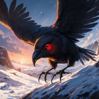 На картинке изображён величественный орёл, сидящий на ледяном утесе на фоне заснеженной горы под ярким закатным небом. Орёл крупный и детализированный, с широко расправленными мощными крыльями, будто готовый взлететь или только что приземлившийся. Его перья выполнены в оттенках серого и чёрного, контрастируя с тёплыми тонами заката. На заднем плане видны силуэты, разбросанные по ландшафту, возможно, другие птицы или животные, но они не являются главным фокусом картинки. Общая атмосфера одновременно спокойная и динамичная благодаря сочетанию могущественного орла и драматичного неба.