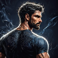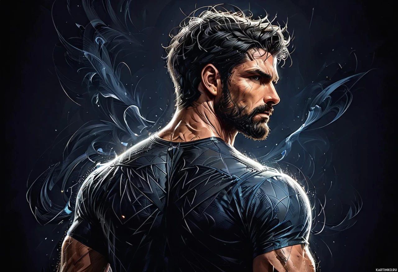 На картинке мужчина, снятый сзади. У него борода, и похоже, он одет в майку без рукавов с принтом на спине, напоминающим мышечные волокна. Фон темный, с синими или белыми частицами энергии, создающими ощущение движения или силы.