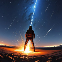 На картинке изображен человек, стоящий спиной к зрителю и смотрящий на яркое зарево синего и красного света или энергии, исходящее из земли. Вокруг него простирается безжизненный пейзаж, погруженный в ночную темноту.
